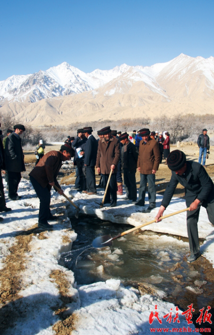 塔吉克人破冰引水,為春耕做好準(zhǔn)備。袁東平 攝影 引自民族畫(huà)報(bào)