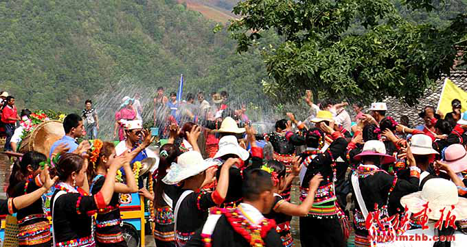節(jié)日清晨,在象腳鼓樂(lè)和歌聲中,年輕人將水桶高高舉過(guò)頭頂,將水滴灑在老年人的手上,祝愿他們生活快樂(lè)、健康長(zhǎng)壽。老人們則伸出雙手,將水捧在手中,口念祝詞,為年輕人道喜、祝福。這種儀式之后,人們便以象腳鼓為前導(dǎo),排成長(zhǎng)隊(duì),擁向泉邊、河畔,唱歌、跳舞,互相追逐、潑水。從頭到腳,全身濕透。這是吉祥的水,祝福的水,人們盡情地潑,盡情地澆,不論是潑水者還是被潑者,都高興異常,笑聲朗朗。楊臘苦介紹說(shuō),澆花節(jié)既是德昂族人民歡度新年的典禮,又是男女青年談情說(shuō)愛(ài),尋找心上人的好時(shí)機(jī)。