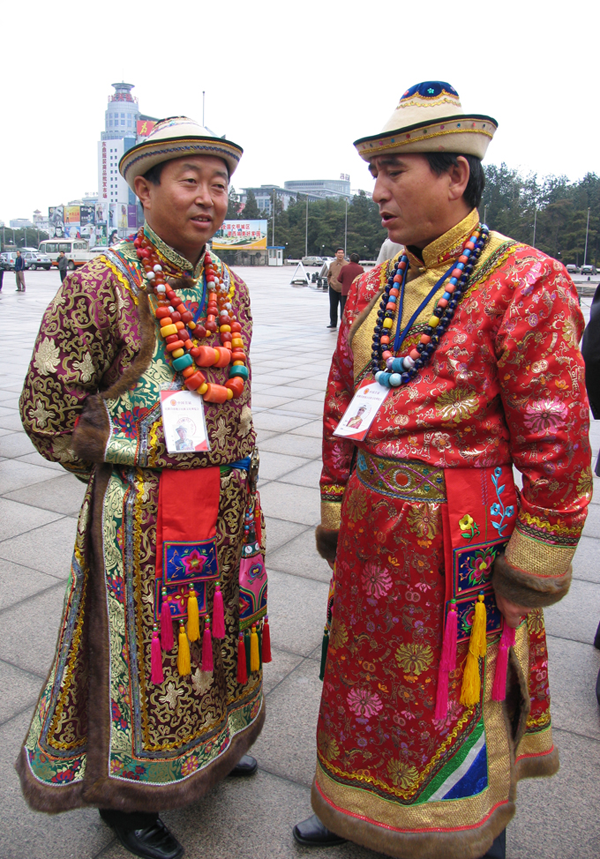 裕固族傳統(tǒng)服裝以御寒為主,皮、毛品是主要材料。在式樣上,以袍服居多,按季節(jié)分為夾袍、棉袍和皮袍,袍長領(lǐng)高,袍子與身體等長,領(lǐng)子與耳根相齊;面料視經(jīng)濟條件而定,過去最好的面料是綢緞,其次是布、羊皮、氈、氆氌。