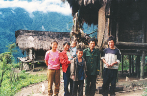 取走竹箭背上弩弓向巴坡返回,一座竹樓里傳出一群孩子的聲音。進(jìn)了屋,大人不在,主人的孩子見到我趕忙攏火燒水,屋里還有鄰家的幾個(gè)孩子。我對(duì)孩子們說,走哇,到外面射箭去。