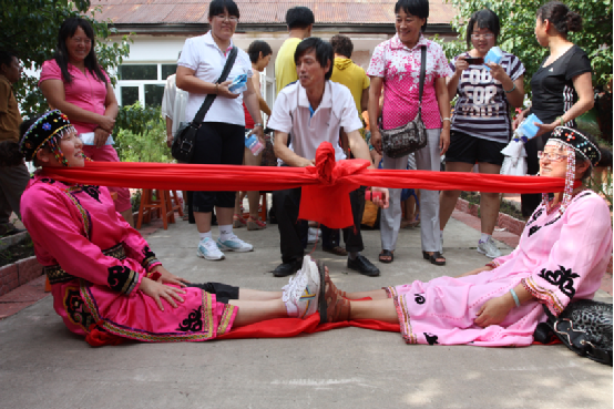 鄂倫春族特別喜歡體育活動,每當(dāng)狩獵閑暇的時(shí)候,便會開展各項(xiàng)體育比賽活動。兩三個(gè)人在一塊平地上,拿出一根皮繩就可以進(jìn)行跳繩比賽;在河邊撿起石頭就可以進(jìn)行投擲比賽;跳到河里又可以進(jìn)行游泳比賽。他們也很樂于進(jìn)行力的較量,摔跤,鄂倫春語稱“娟滴任”,這是獵人們普遍喜愛的一項(xiàng)運(yùn)動,常勝者會贏得人們的贊賞和姑娘的青睞。還有一種較力比賽,鄂倫春語稱“譚滴任”,俗稱“拽棍”。兩人相對坐在地上,雙手緊握一根約半米長的木棍,雙腳平伸雙足相抵。比賽開始,雙方拼力拽拉木棍,將對方拉起來為勝。