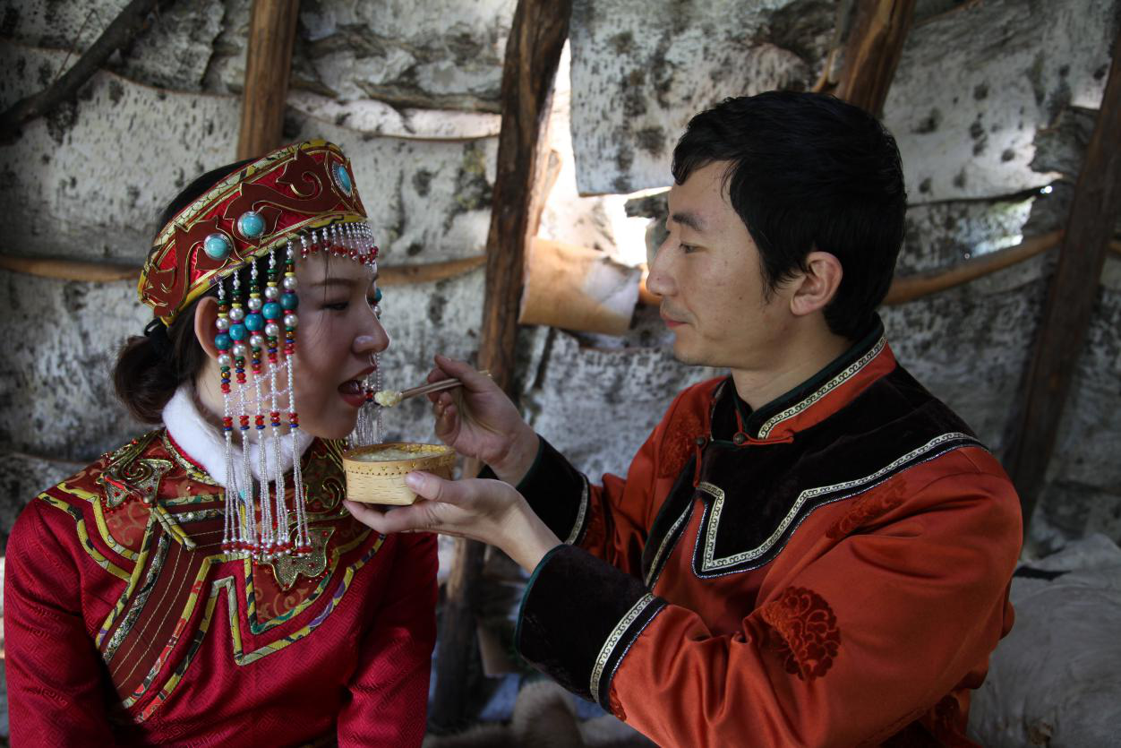 鄂倫春族的傳統(tǒng)婚姻多由父母包辦,比較盛行定娃娃親和指腹為婚。沒有定娃娃親和指腹為婚的,則由雙方父母包辦確定婚姻關系。男方向女方求婚成功后,男方家就開始積極著手準備,擇吉日到女方家舉行認親儀式。屆時,由媒人、男方的母親或嬸嬸帶著男方本人,還有一些其它親友陪同,攜帶酒肉前往女方家,宴請女方的親屬。席間,小伙子要給女方的所有長輩(女方父母除外)敬酒磕頭,這就是所謂的“認親”,鄂倫春語叫“參突拉日恩”。此時男女雙方都要改變裝束,小伙子穿的坎肩肩頭和背部要刺繡云卷紋,還要在肩上縫紅布;姑娘要修鬢角,并將兩條辮子纏繞到頭上,以后別人看到這種裝束就知道他們已經(jīng)訂婚了。