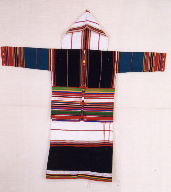 基諾族婦女上衣為無領(lǐng)對(duì)開,上半部多采用黑布或白布,下半部及衣袖用紅、藍(lán)、黃、白等7色布配制或刺繡而成,用紅色鑲邊,上衣背部縫一塊約3寸見方的白布,上面繡有圓形太陽(yáng)花式圖案(基諾族稱月亮花);內(nèi)衣為上部呈方形下呈菱形的兜肚式緊身衣,上部方形為鮮艷的條飾花紋,下部菱形繡著各式圖案。下身多著紅色鑲邊的黑色合縫短裙,并用一尺左右的黑布纏綁小腿。發(fā)型為椎髻,婚前髻在腦后右方,婚后髻在前額正中。頭戴披風(fēng)式尖帽,這種尖帽用長(zhǎng)約60公分、寬23公分的豎線花紋土布對(duì)折,縫住其一邊而成,戴時(shí)又在帽沿上折起一指許的一道邊。