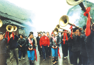 苗族姑娘們,穿鑲花邊衣褲,圍繡花抹裙,扎花絲頭巾,配銀飾花帶,可真叫艷麗。我們這些遠道而來的游客受到熱烈的迎接,姑娘們用古樸的攔門對歌為我們洗塵。攔門地點是在村頭的小橋邊,姑娘們拉著一排民族織錦帶,滿面春風地等待客人,兩邊苗鼓、獅子、嗩吶、甲馬長號夾道歡迎。儀式按苗族風俗,由苗族姑娘們先唱熱情的迎客苗歌,再請客人唱歌作客,對歌三次方過攔門第一關。緊接著她們又捧出大碗苞谷酒向客人們一一敬酒。熱情好客的姑娘們一定要待客人喝了香醇的美酒后,才示攔門結(jié)束。然后,又一路鞭炮,一路號角吹吹打打,把我們請進苗寨。