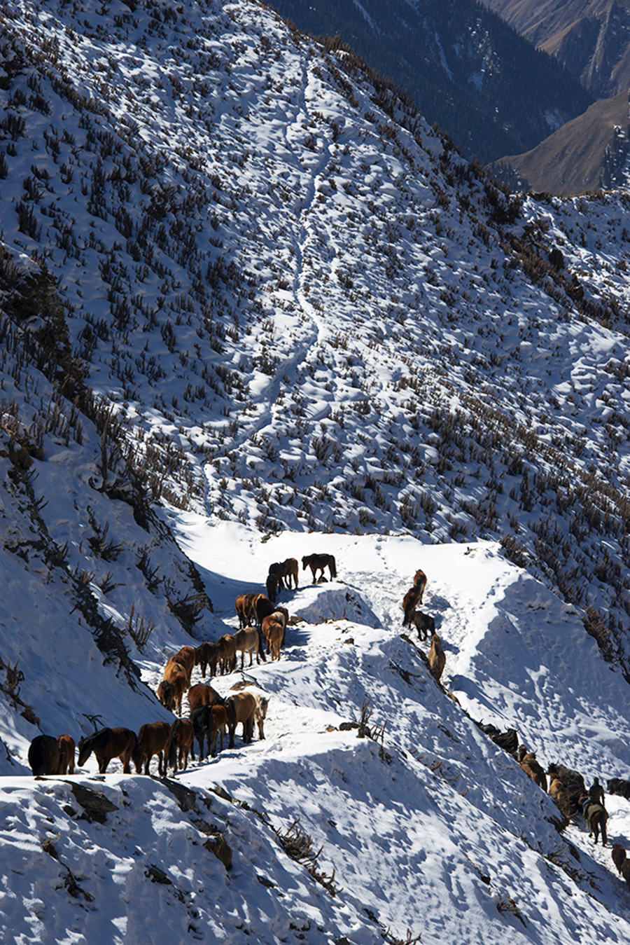 喬隆格爾冬牧場(chǎng)與山外的氣候差異大,暖陽如春。另一個(gè)突出特點(diǎn)是草好,草密的地方?jīng)]膝,縱橫倒伏一片,比南方秋田摞在一起的蒲草都密實(shí)。空氣清洌,腐草味兒、上一年遺留的畜糞味兒和著遠(yuǎn)處高大冰崖透散過來的寒氣撲面而來,最突出的還有野生動(dòng)物的腥氣,牧羊犬夜夜不停地叫聲在告訴你它們往復(fù)經(jīng)過的頻率。山上能看到大角的北山羊,野鵪鶉被驚到嘩啦啦地飛起一片。若是誰家的羊死了扔在野外,幾天都能看到禿鷲在天空盤旋。最不可思議的是雪豹,光顧一次造成的損失遠(yuǎn)比一群狼大。