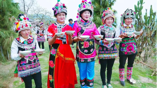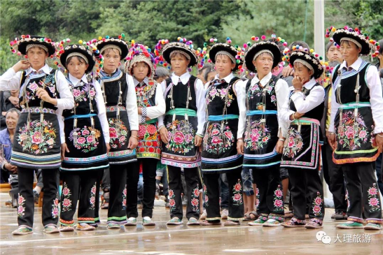男子頭頂氈帽(又稱氈窩),穿大襟衣、大襠褲,赤足或穿草鞋,披羊皮,外出背皮袋(現(xiàn)已基本消失)。女子裹高包頭、額上飾銀桂花,衣為布襟,外套坎肩,腰系大圍腰,大圍腰左右下三邊繡五色花,為動植物圖案,足穿繡花鳳頭鞋,用本地產(chǎn)綠布條制褲子,不鎖腳邊,腰間背圓形白氈裹背,所穿服飾顏色鮮艷、質(zhì)地厚重,盡顯遠(yuǎn)古南詔皇室服飾遺風(fēng)。