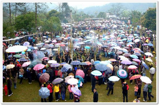 廣西融水縣的香粉古龍坡會(huì)于每年農(nóng)歷正月十六舉行,所以又名“十六”坡。這一天、來(lái)自外國(guó)朋友、各地的游客及當(dāng)?shù)胤綀A十里的苗哥苗妹,提蘆笙,提鳥(niǎo)籠、牽馬匹,打花傘……朝著十六坡趕來(lái)。正午時(shí)分,山梁上、村道間、河溪旁,出現(xiàn)了成列成隊(duì)穿紅戴綠的人群。遠(yuǎn)遠(yuǎn)望去,似一條彩帶在飄動(dòng)。當(dāng)萬(wàn)余人江集后,整個(gè)坡地就成了彩色的世界。