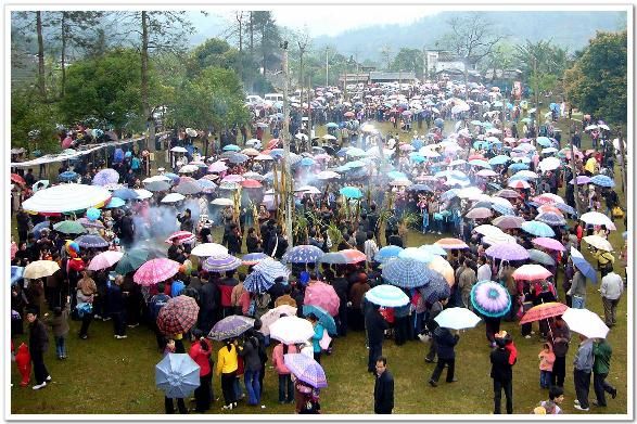 香粉古龍坡會于每年農歷正月十六舉行,所以又名“十六”坡。這一天、來自外國朋友、各地的游客及當地方圓十里的苗哥苗妹,提蘆笙,提鳥籠、牽馬匹,打花傘……朝著十六坡趕來。正午時分,山梁上、村道間、河溪旁,出現了成列成隊穿紅戴綠的人群。遠遠望去,似一條彩帶在飄動。當萬余人匯集后,整個坡地就成了彩色的世界。