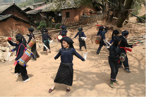 蜂桶鼓舞是布朗族的群眾性舞蹈,分為三步和五步兩種。演出時(shí),由兩名年輕男女雙手各持一條“帕節(jié)”(即毛巾)在前面跳“帕節(jié)舞”引導(dǎo),舞蹈動(dòng)作主要是甩手巾。其后是蜂桶鼓隊(duì),一般為4—6只,后緊隨2只象腳鼓,之后是6人敲打的大、中、小芒和镲,最后是跟著跳舞的人們和助興的老幼。蜂桶鼓舞的節(jié)奏明快熱烈,幾種打擊樂器相配合,“嘣咚、嘣咚……嘭嚓、嘭嚓……鏘切、鏘切……”,高、中、低音融為一體,獨(dú)具情趣。動(dòng)作大方、瀟灑、粗獷、活潑;舞姿輕盈、柔和、細(xì)膩。大南直布朗蜂桶鼓隊(duì)多次被邀赴省城和省外演出,向人們展示了本民族獨(dú)特的文化藝術(shù)風(fēng)采。