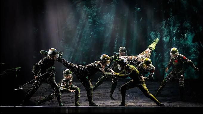 在舞劇敘事方式上,總編導(dǎo)之一董華興將民族性與現(xiàn)代性相互融合,嘗試了時空切割,段落重組,故事情節(jié)的倒敘、插敘,真實(shí)性與虛擬性相結(jié)合等方法。
