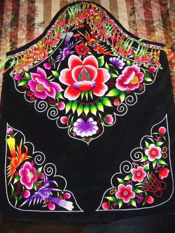 彝族婦女圍腰,是女性審美的結(jié)晶,實(shí)用美觀(guān)。圍腰是最能集中體現(xiàn)彝族女性心靈手巧的女紅作品,因此成為青年男子傳統(tǒng)擇偶的重要標(biāo)準(zhǔn)之一。每條彝族圍腰,須經(jīng)過(guò)剪紙、裁剪、刺繡、挑花、配飾等環(huán)節(jié),每一個(gè)細(xì)微的過(guò)程都傾注了彝女的聰明與才智。事實(shí)上,彝族婦女圍腰,還蘊(yùn)含著重要的彝族社會(huì)歷史、文化信息。