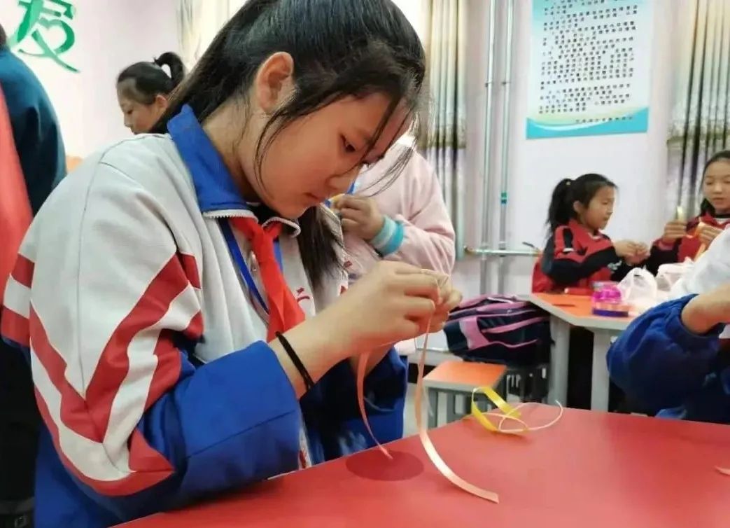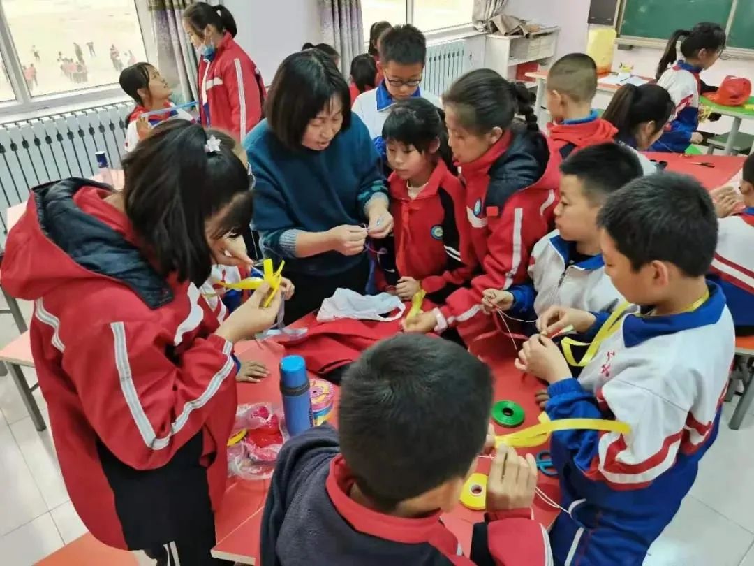 葛玉英說(shuō):”芨芨草手工編織品主要有簍、筐、盒、盤、茶墊、時(shí)尚包等生活用品,色彩以白、藍(lán)為主,圖案以白云紋、曲字紋為主,以針繡法結(jié)合草編中的平編、絞編、編花、纏邊、擰編等技法進(jìn)行編織。在實(shí)際教學(xué)中,為了方便,我用彩帶代替芨芨草,讓芨芨草編織技藝在孩子們的濃厚興趣中得到傳承,既提高了學(xué)生的動(dòng)手能力,也提升了學(xué)生的審美思維和審美能力,同時(shí)增強(qiáng)了學(xué)生對(duì)本土文化的自豪感和自信力。”