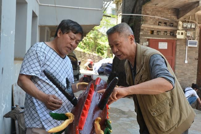 家住鎮(zhèn)遠(yuǎn)縣?陽鎮(zhèn)東關(guān)社區(qū)的皇安東,今年68歲,雖然年近古稀,但精氣神堪比五十來歲的中年人,皇安東介紹由于個人愛好,8歲時與龍舟接下了深厚的情緣,對“龍”文化研究的執(zhí)著像一如往日對戀愛的投入充滿激情和憧憬一樣,經(jīng)過60多年的龍舟文化研究探索,他手工雕刻的龍頭威武靈動融匯鎮(zhèn)遠(yuǎn)傳統(tǒng)文化精髓,“鎮(zhèn)遠(yuǎn)賽龍舟”已被列為國家非物質(zhì)文化遺產(chǎn)項目名錄?;拾矕|49歲開始自學(xué)雕刻龍頭,鎮(zhèn)遠(yuǎn)端午節(jié)每年祭祀用的龍頭幾乎出自他手,雕刻的龍頭已上數(shù)百頭。當(dāng)筆者提到皇安東為何歷經(jīng)六十多年對雕龍頭的“手藝”癡心不改時,他笑著爽朗地說:“我一生雕龍頭,主要的精神動力是對鎮(zhèn)遠(yuǎn)傳統(tǒng)龍舟文化的熱愛和傳承?!被拾矕|一家人整天在“龍”的藝術(shù)空間里過得有滋有味。