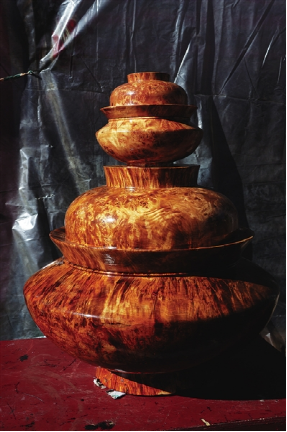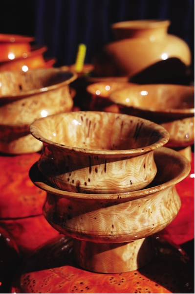 官員們使用的木碗,固然也非常注重外面的金銀寶石包裹,而木碗本身,也有一套非常固定的學(xué)問(wèn),盛開水不裂,摔到地上不會(huì)破,不燙手不冰手,體輕而質(zhì)固,經(jīng)久耐用,可以爺孫相傳。用這種碗盛食,可以完全保持食物原味,吃酥油糌粑等油肉類食品猶為適宜。比之于一般瓷碗,是碗中上品。這種木碗一般都是選用一些稀有雜木的節(jié)或者根雕琢而成,除了材料本身,在加工過(guò)程中的工序也十分重要,必須要加工出來(lái)一些獨(dú)特的花紋,比如磷火紋,或豬鬃紋,或貓頭鷹眼紋等,有這種花紋的碗,就要格外名貴,比如這次普布次仁兄弟所制作的大型核桃木碗,全身均勻地布滿了貓頭鷹眼紋,所以才能賣出這么高的價(jià)格。在西藏很多地區(qū),都流傳著這樣一個(gè)諺語(yǔ):“一只上等木碗等于10頭牦牛?!?/p>