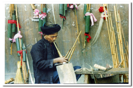 蘆笙由笙斗、笙管、簧片和共鳴筒四個部件構成。