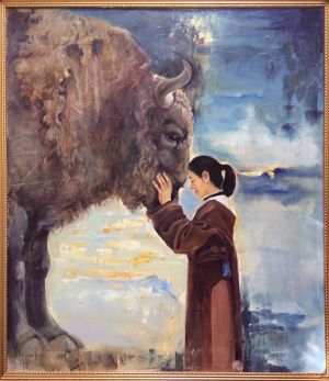 雍忠卓瑪?shù)膫€(gè)人畫(huà)展受到業(yè)內(nèi)外的諸多好評(píng),也有觀眾專程從外地去拉薩觀展。展覽結(jié)束當(dāng)天,雍忠卓瑪特意和畫(huà)作《我和它》合影,并將合影發(fā)布在社交平臺(tái)上。“這是我與牦牛博物館結(jié)緣的作品。”她向記者介紹。畫(huà)面上,穿著藏袍的少女閉著眼睛,用左手撫摸牦牛的面頰,額頭輕觸牦牛鼻尖,表情寧?kù)o祥和。