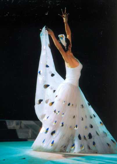 傣族孔雀舞動作有著嚴(yán)格的程式和要求:孔雀舞一般由一、二人或三人表演,多為模仿孔雀飛出窩巢、靈敏視探 、安然漫步、尋水、飲水、戲水、洗澡、抖翅、曬翅、展翅與萬物比美、自由幸福。每個動作之前有起式,完了后有收式;有固定的步法、位置圖及固定的動作組合;每個動作組合又有固定的鼓點伴奏。架子孔雀舞的舞蹈語匯尤為豐富,有“飛跑下山”“林中窺看”“漫步森林”“抖翅”“點水”等惟妙惟肖模擬孔雀神態(tài)的動作(圖為傣族著名舞蹈家楊麗萍表演孔雀舞,劉軍供圖)。