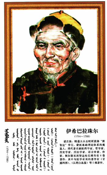 伊希巴拉珠爾(1704~1788),蒙古族,一名也協(xié)班覺(jué)、額爾德尼班智達(dá)·松巴堪布,蒙古衛(wèi)拉特人,著名蒙醫(yī)學(xué)家、文學(xué)家、天文學(xué)家哲學(xué)家。一生著作豐厚,其中對(duì)完善蒙醫(yī)理論體系有重要影響的著作有《甘露之泉》、《白露醫(yī)法從新》、《甘露點(diǎn)滴》、《甘露匯集》和《認(rèn)藥水晶鑒》,在這些著作中他將藏醫(yī)學(xué)理論與蒙古人的體質(zhì)、生活習(xí)俗、居住地區(qū)的地理、氣候條件等具體實(shí)際結(jié)合在一起,進(jìn)行創(chuàng)造性的理論研究,不僅豐富了臨床實(shí)踐的內(nèi)容,而且補(bǔ)充和完善了蒙醫(yī)學(xué)的理論體系,他將傳統(tǒng)蒙醫(yī)學(xué)“寒熱理論”與《四部醫(yī)典》中關(guān)于寒熱病理論的闡述進(jìn)行有機(jī)結(jié)合,使之成為近代蒙醫(yī)學(xué)病性辯證的總綱,同時(shí),他也闡述了將六基癥作為病因鑒別診斷的核心及其臨床表現(xiàn),使“六基癥”學(xué)說(shuō)從理論到實(shí)踐都獲得了比較系統(tǒng)的發(fā)展。占布拉道爾吉是19世紀(jì)著名的蒙藥學(xué)家,他編著的《蒙藥正典》(又名嗚嗚蒙藥圖鑒)共收載蒙醫(yī)臨床常用藥物879種,按礦物、植物和動(dòng)物等分為8部24類,附插圖576幅,對(duì)每種藥物的產(chǎn)地、形態(tài)、性味、功能、入藥部分、采集加工、炮制方法、主治、用法等都闡述詳盡,并且每一味藥物都標(biāo)寫(xiě)了蒙、藏、滿、漢四種文字的藥名,具有很高的參考價(jià)值。該書(shū)還附有外科術(shù)療器具圖解,以及放血穴位、針灸穴位、人體各部分劃分圖解說(shuō)明等。敏如爾古布拉(1789-1838)編撰了蒙醫(yī)學(xué)方劑巨著《方?!?,是一部比較系統(tǒng)完整的蒙醫(yī)藥物方劑學(xué)經(jīng)典著作,收載方劑近200種,分為76章,進(jìn)行詳盡的論述和評(píng)點(diǎn),同時(shí)對(duì)相關(guān)疾病的病因、病機(jī)、分類和治法等也做了簡(jiǎn)要論述。