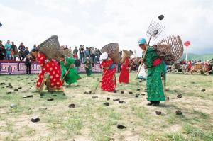 當(dāng)然,后來那達(dá)慕增加了許多新項(xiàng)目,比如賽駱駝、提水、縫蒙古袍扣子、撿牛糞、打斷牛骨比賽、蒙古象棋比賽、沙嘎(羊拐)比賽等。在北京舉辦的那達(dá)慕里,還融入了現(xiàn)代三大球類比賽項(xiàng)目,為了集體參與,增加了拔河比賽、扔沙包、服飾比賽、兒童說蒙古語比賽、兒童唱歌比賽等。