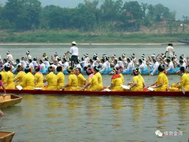 每年的潑水節(jié),西雙版納傣族都要舉行橫渡瀾滄江的賽龍舟活動。一般在潑水節(jié)的第一天舉行。比賽時,江上停泊著披綠掛彩的龍船,船上坐著數(shù)十名精壯的水手,船中間站立1人擊鑼指揮,號令一響,整裝待發(fā)的龍船像箭一般往前飛去,在規(guī)定的范圍內,哪一隊先到達目的地為勝。
