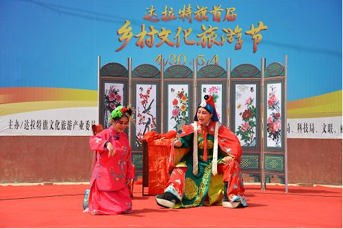 達拉特道情富有濃郁的地方色彩,生、旦、丑等行當齊全,包括“唱、念、做、打”四功,不過由于它演唱內(nèi)容的關(guān)系,以“唱、念、做”三功為主。音樂體制主要為曲牌連綴體,同時吸收了地方小戲與北路梆子的音樂元素,又兼有地方大戲的部分唱腔曲調(diào),演唱方式以坐唱為主,樂器伴奏分為文場和武場,音樂婉轉(zhuǎn)纏綿、節(jié)奏明快,曲調(diào)開朗而流暢,唱白多運用地方方言,藝術(shù)風格柔美而抒情,充盈了濃郁的鄉(xiāng)土生活氣息。