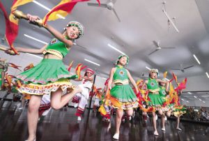 “同學(xué)們,耍起來的時候一定要把手臂擺起來?!痹诙魇┦邪沤抖弊遴l(xiāng)民族初級中學(xué),老師正在給學(xué)生們傳授表演非物質(zhì)文化遺產(chǎn)板凳龍的技巧。為傳承中華優(yōu)秀傳統(tǒng)文化,學(xué)校開設(shè)了特色課程?!靶埴椪钩帷薄把┨焐w頂”“黃龍纏腰”“猛虎下山”……老師教得耐心細致,學(xué)生舞得有模有樣。