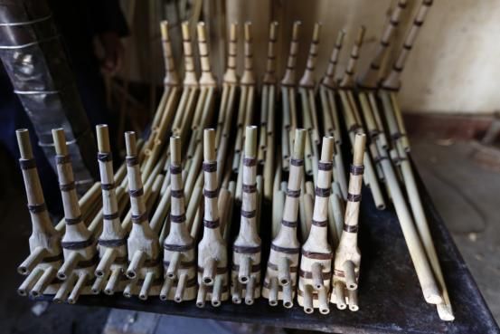 與舞臺(tái)表現(xiàn)所用的十幾管甚至二十幾管的蘆笙不同,高坡蘆笙主要是苗族傳統(tǒng)的六管蘆笙,分為大中小不同型號(hào)。蘆笙的制作材料為苦竹(蘆笙竹),原來(lái)主要產(chǎn)于貴定縣鞏固鄉(xiāng)的楊柳塘,1985年后,他們從楊柳塘將蘆笙竹移栽至高坡鄉(xiāng)批林等地,成為目前制作蘆笙的主要原料。