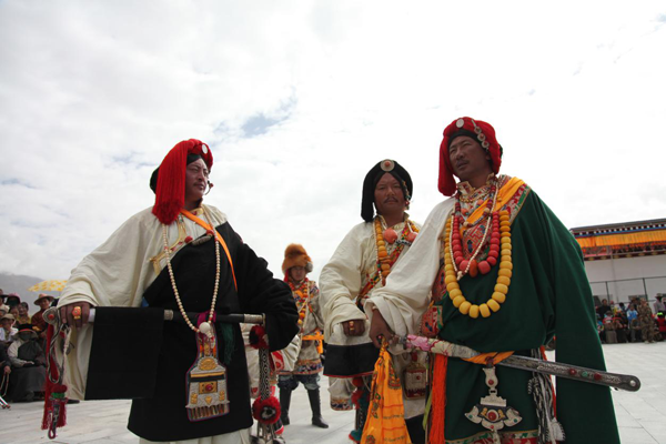 藏族分布在全國五省區(qū),因氣候、環(huán)境的不同,形成了豐富多彩的服飾文化。藏族服飾有“隔山兩個樣的”說法,有人統(tǒng)計,因地域、男女、年齡、婚否和季節(jié)的不同,藏族服飾有100多種。男裝各地大同小異,上身穿寬大的藏袍,袖長及膝。束各種腰帶。寬大的藏袍非常適應青藏高原多變的氣候,露出右臂便于勞作,天熱時將脫掉兩袖,將藏袍扎在腰間,天冷時套上雙袖。西藏人的服飾樣式很多,有衛(wèi)藏類服飾、康巴類服飾、安多類服飾和拉薩裝。衛(wèi)藏主要指除昌都地區(qū)以外的西藏大部分地區(qū)。西藏大部分地區(qū)的男裝,主要衣料是氆氌,城鎮(zhèn)人多穿黑色,農(nóng)牧民多穿白色??蛋椭饕肝鞑氐牟己颓嗪5挠駱?、果洛一帶。男子多內(nèi)穿右襟齊臍短襖,外罩圓領寬袖長袍。頭戴狐皮帽或“扎秀”(發(fā)辮纏紅絲線),扎腳穿高筒靴顯得英俊瀟灑。女子穿長袖衫,外罩坎肩,腰束彩條圍裙。講究腰帶和腰刀,腰帶和腰刀上要鑲嵌金銀珠寶。女子多戴名貴飾品,顯得華麗昂貴。安多藏區(qū)主要指西藏那曲與安多縣接壤的地方。過去,男裝衣領、袖口,下擺多飾虎豹皮,女裝邊飾多為水獺皮,而且項、腕、手指和腰間配有金銀寶石飾物。