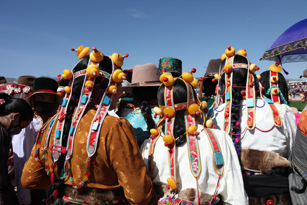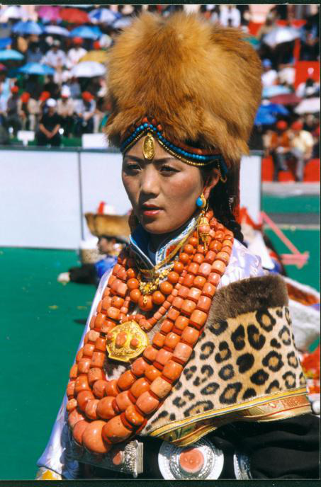 藏族婦女發(fā)飾因地域之別而顯得豐富多彩。西藏部分地方的婦女喜戴巴珠,拉薩附近的婦女所戴三角形巴珠,平系與頭頂,兩枝向前,將分梳的兩條發(fā)辮分別盤在兩枝上。日喀則、江孜一帶的婦女戴弓形巴珠,弓背向上,梳成多條的發(fā)辮分別掛在弓的兩端。貴重的巴珠上面鑲有珊瑚、瑪瑙等,顯得富麗堂皇。姑娘一戴巴珠,就意為著長(zhǎng)大成人,因此,第一次戴巴珠時(shí),家中要為姑娘舉行傳統(tǒng)的成人儀式。
